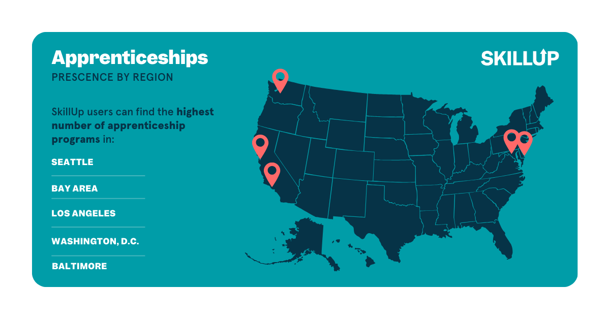The highest concentration of apprenticeship programs on SkillUp is in Seattle, the Bay Area, Los Angeles, Washington D.C., and Baltimore. If you're in or near one of these cities, your options are particularly strong.