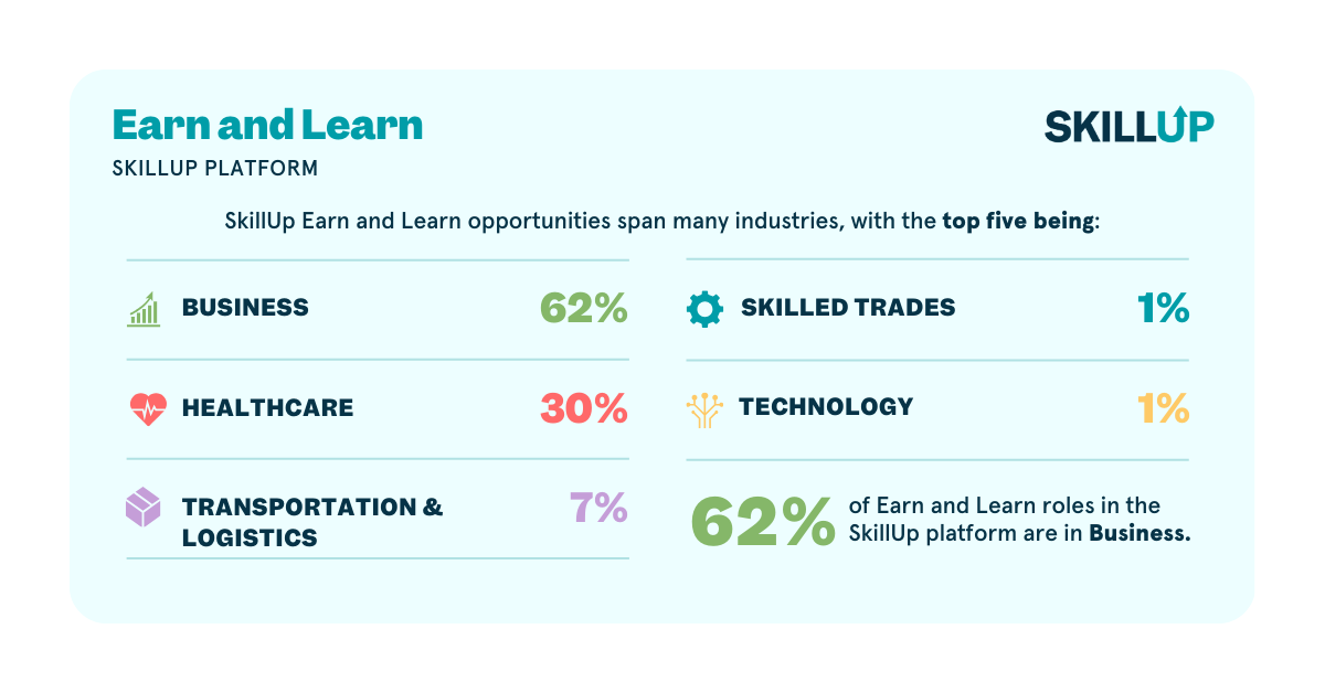 While Earn and Learn roles have historically made up about 5% of all jobs in the SkillUp catalog, that 5% has translated to more than 32,000 roles over the last three years. And 24% of all job referrals on SkillUp have been to Earn and Learn positions. This is a sign that users are actively seeking this kind of opportunity.