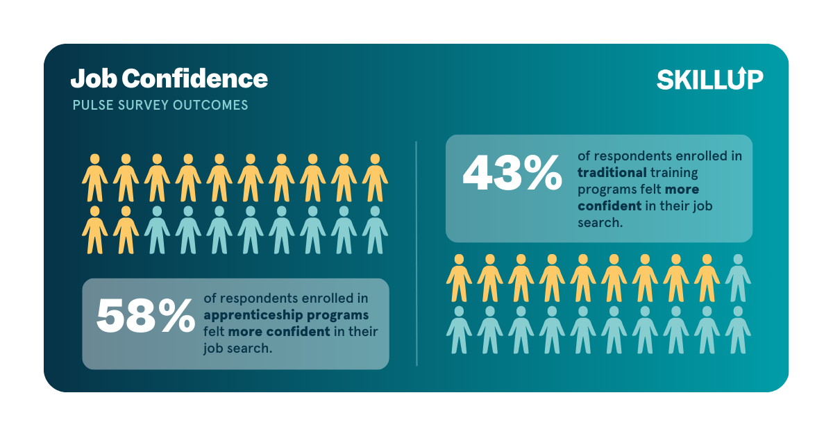 SkillUp's Pulse Survey data gives a clear answer. Among respondents enrolled in apprenticeship programs, the average age is 20, and 58% said they feel more confident in their job search compared to peers in traditional training programs. For non-apprenticeship users enrolled in a program, the average age is 43, and only 43% reported feeling confident.