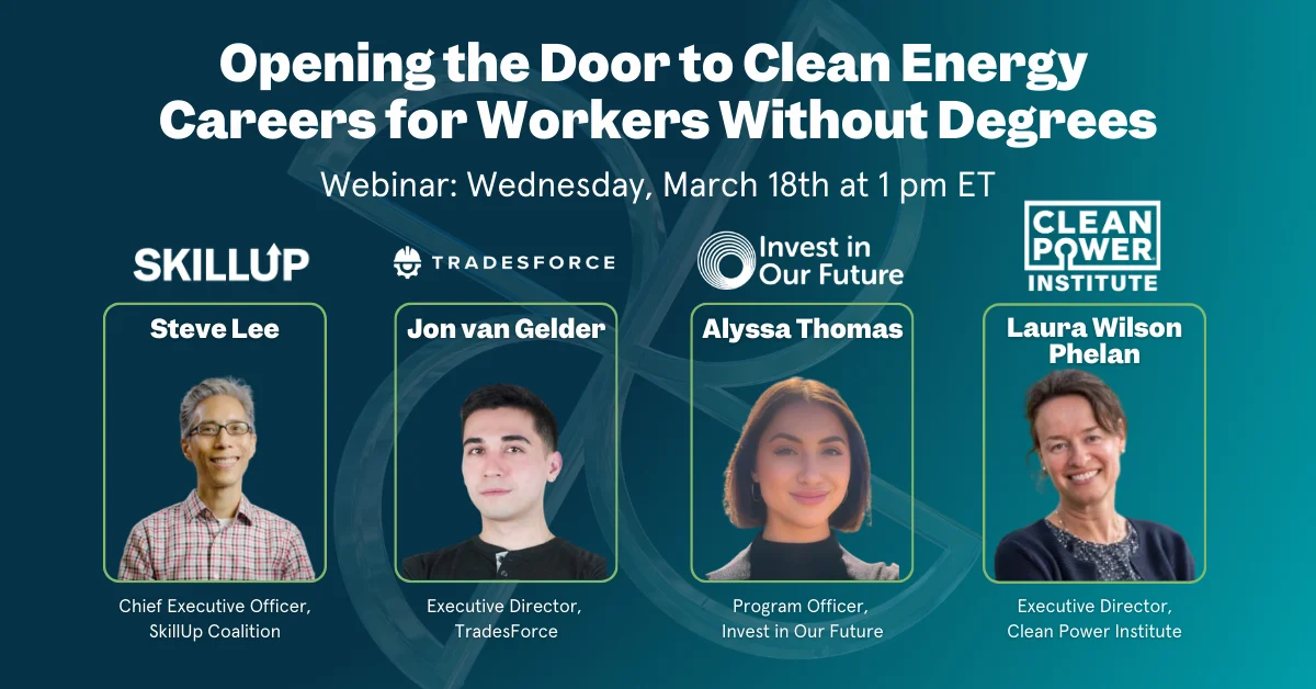 The clean energy revolution won't build itself. Driven by historic electricity demands from new data centers and the urgent need for grid reliability, the market is dictating an aggressive, immediate infrastructure build-out. However, we face a massive skilled trades shortage that threatens deployment. To meet this demand, we must aggressively open the door to inclusive pathways for workers skilled through alternative routes (STARs). At SkillUp, we are uniting philanthropy, workforce innovators, and industry to dismantle cultural stigmas, abandon failing training models, and scale high-paying, AI-resilient career pathways for workers without degrees.