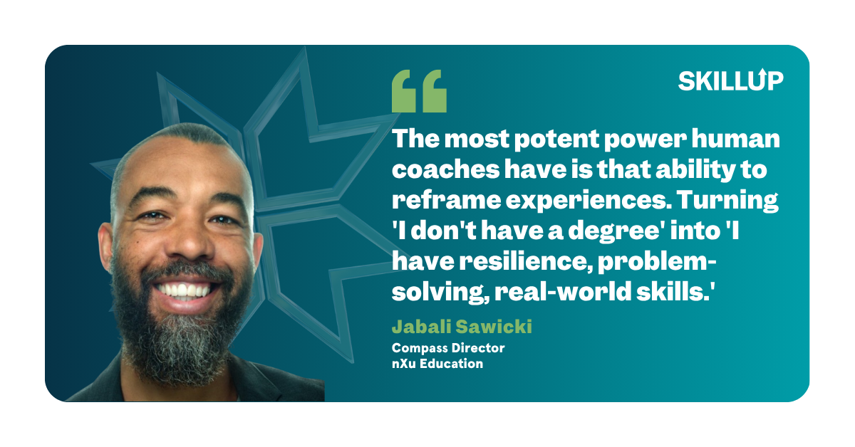 "Purpose helps STARs reframe their lived experience," said Jabali Sawicki, Compass Director at nXu, during a recent SkillUp webinar on human-centered coaching in the age of AI. "Instead of seeing themselves through a deficit mindset, through a lens of what they may lack — a degree, a network, social capital — they start viewing their lived experiences as assets connected to a larger mission."