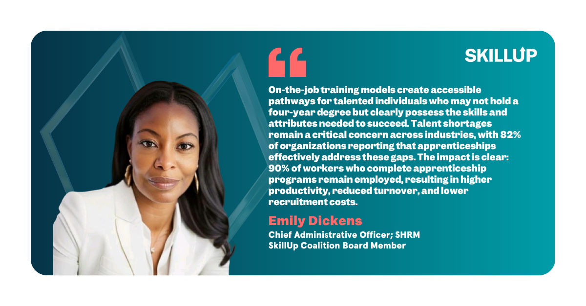 "On-the-job training models create accessible pathways for talented individuals who may not hold a four-year degree but clearly possess the skills and attributes needed to succeed,” said Emily Dickens, Chief Administrative Officer at SHRM and SkillUp Board Member. "Talent shortages remain a critical concern across industries, with 82% of organizations reporting that apprenticeships effectively address these gaps. The impact is clear: 90% of workers who complete apprenticeship programs remain employed, resulting in higher productivity, reduced turnover, and lower recruitment costs.”