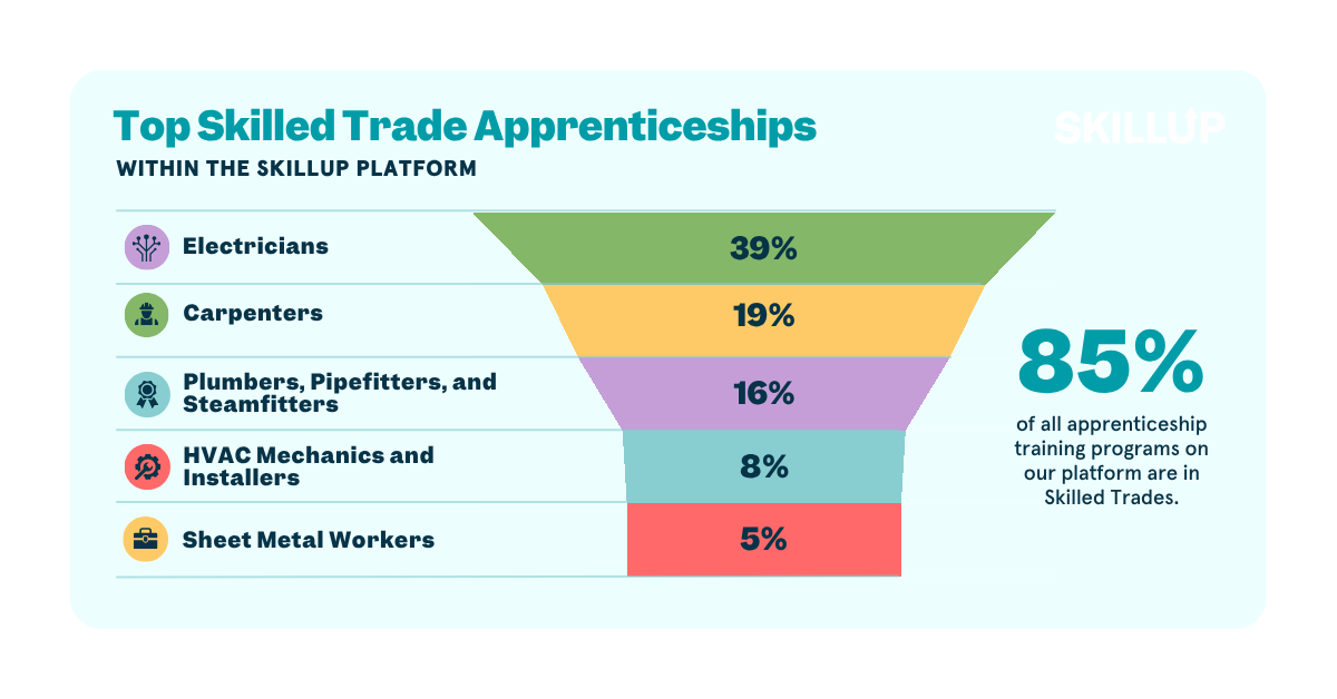 Skilled trades are still the largest industry in apprenticeship, comprising 85% of offerings on our platform. Electricians alone account for 39% of all apprenticeships. Plumbers, pipefitters, carpenters, HVAC technicians and sheet metal workers round out the top offerings.