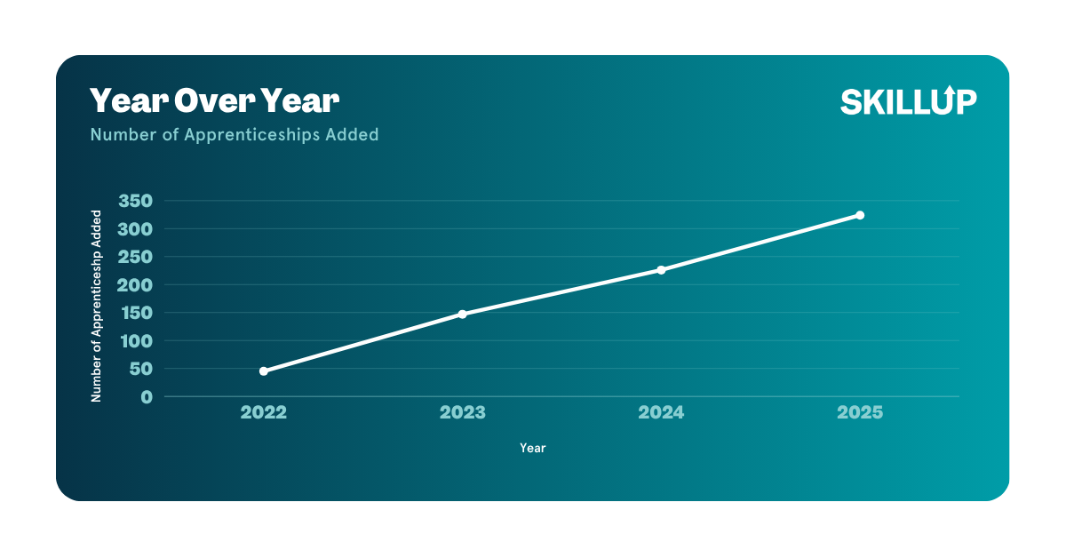 On SkillUp's platform, apprenticeship offerings have grown significantly over the years. In our jobs catalog, we’ve seen 600% growth in apprenticeship job opportunities offered directly by employers. There are also over 833 apprenticeship training programs available from training providers, representing 9% of our training catalog. Our catalogs are updated multiple times per week to reflect real-time demand and, as always, are deeply vetted and quality standards aligned.
