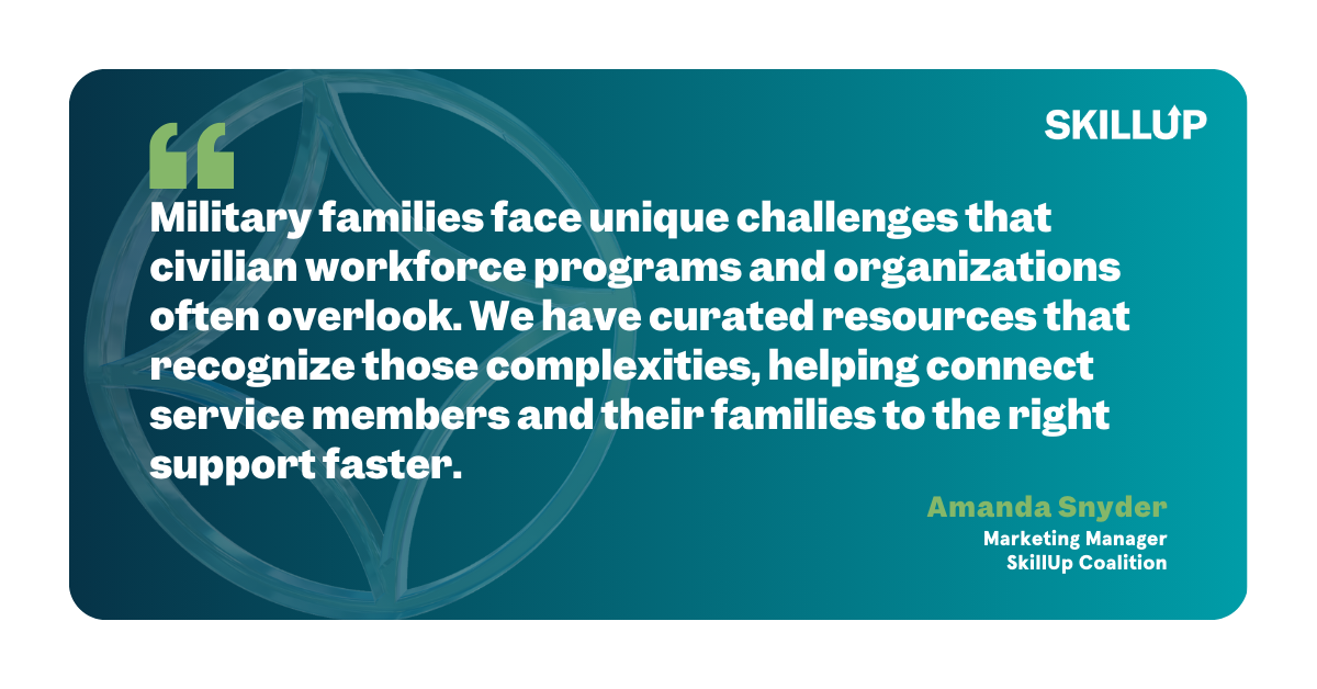 “Military families face unique challenges that civilian workforce programs and organizations often overlook,” said Amanda Snyder, Marketing Manager at SkillUp and a military spouse herself. “We have curated resources that recognize those complexities, helping connect service members and their families to the right support faster.” SkillUp's Resources for Veterans Guide points service members and their families to specialized resources and services including career transition assistance, mental health resources, educational benefits navigation and programs specifically designed for military career intricacies. “Our guide was fully designed with the lived experience of military families in mind,” said Snyder.