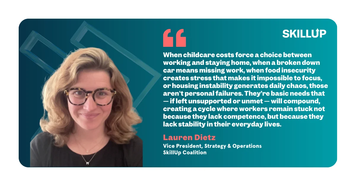 “When childcare costs force a choice between working and staying home, when a broken down car means missing work, when food insecurity creates stress that makes it impossible to focus, or housing instability generates daily chaos, those aren't personal failures,” said Lauren Dietz, Senior Director of Strategy & Operations at SkillUp. “They’re basic needs that — if left unsupported or unmet — will compound, creating a cycle where workers remain stuck not because they lack competence, but because they lack stability in their everyday lives.”